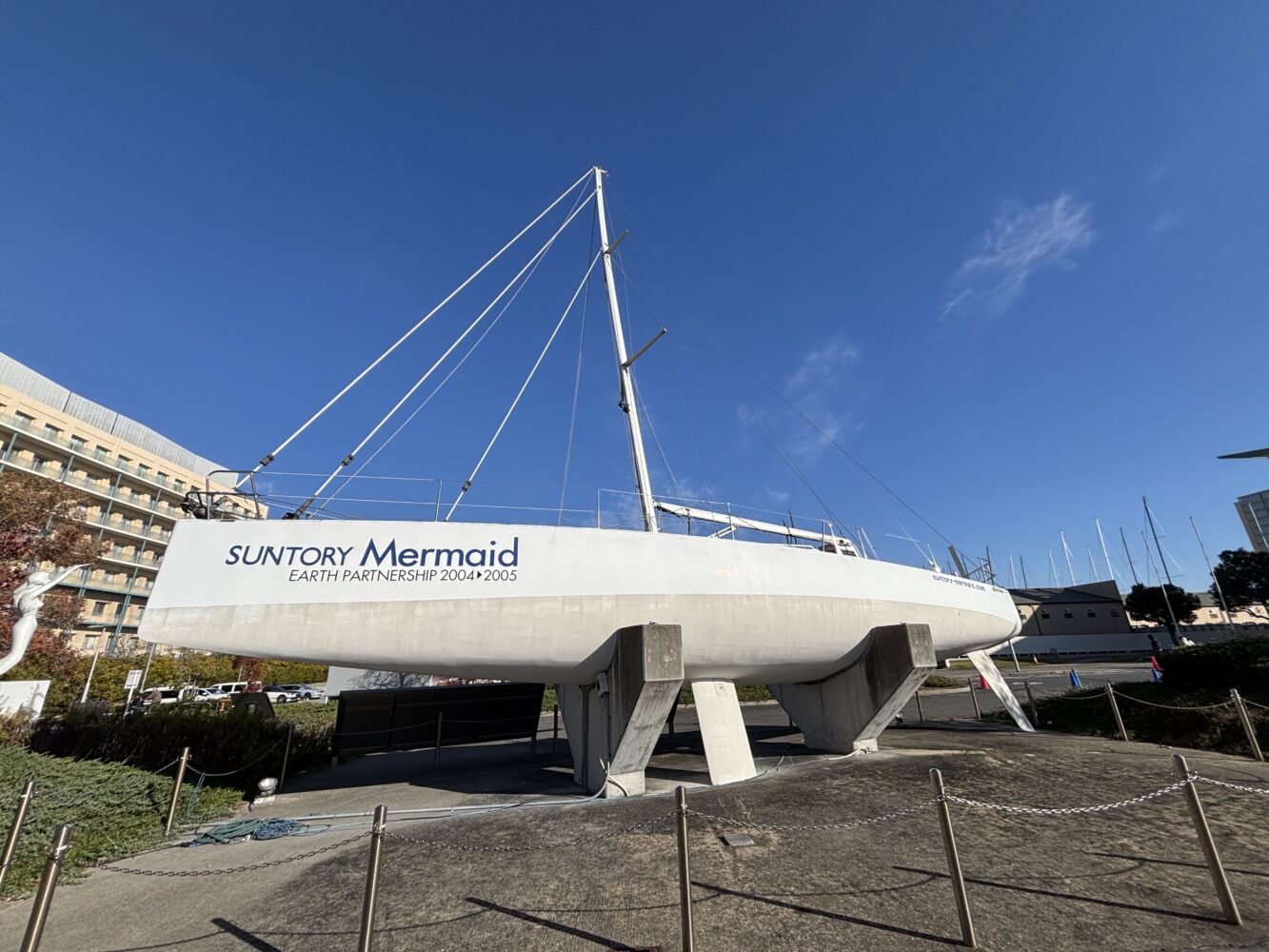 因みに、堀江謙一さんが2004年10月から2005年6月にかけて行われた**単独無寄港世界一周航海(ホーン岬東回り)**で使用されたSUNTORY Mermaid号が北側の駐車場に展示されています♬