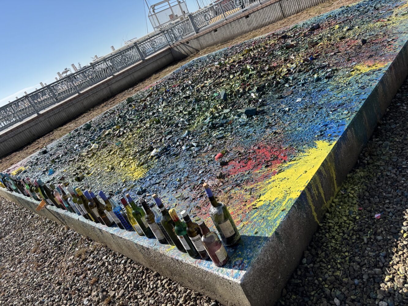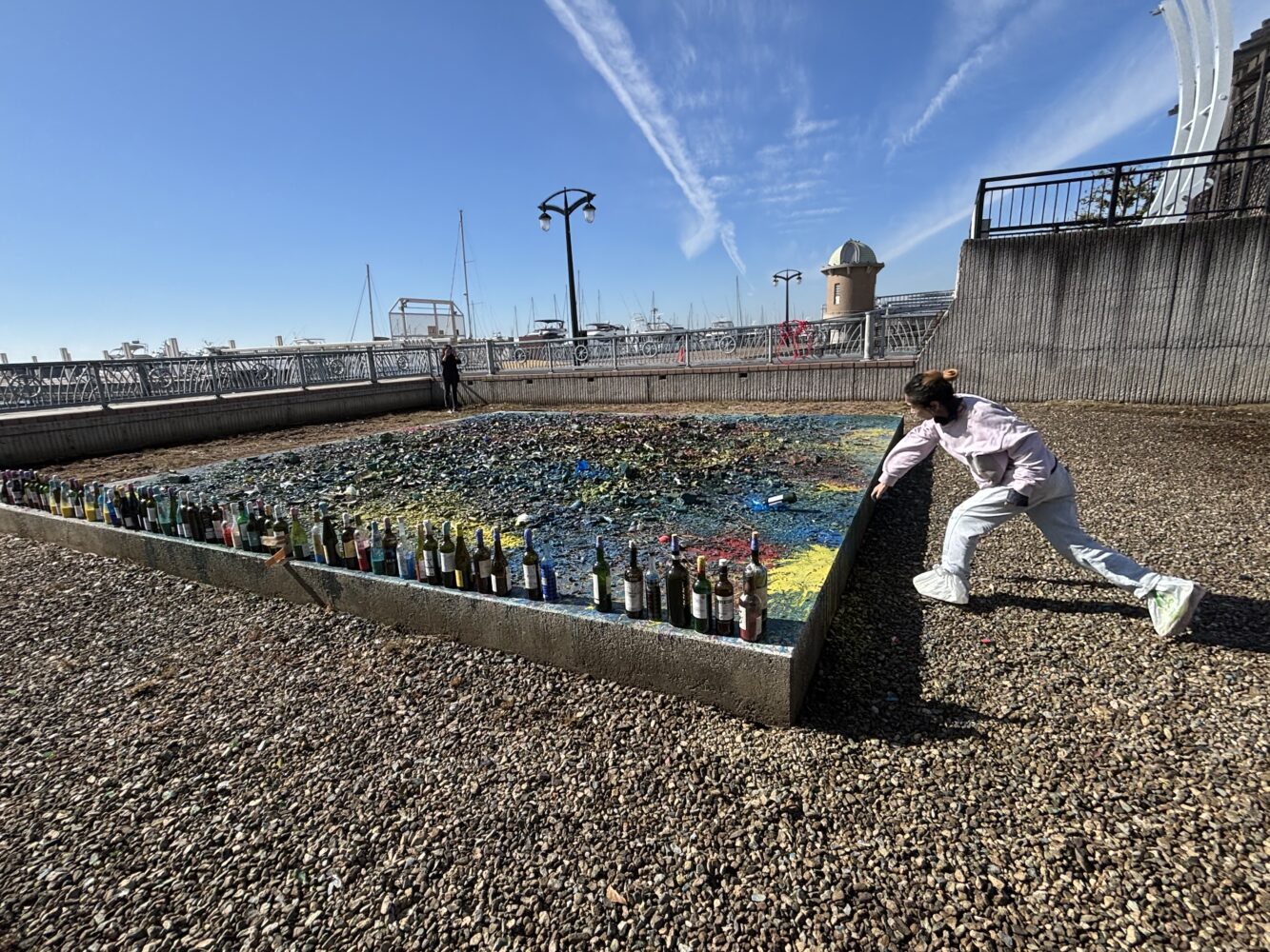アクリル絵の具が入ったワイン瓶を用意していただいていて、その瓶を投げつけて絵?を描いていく催しです。