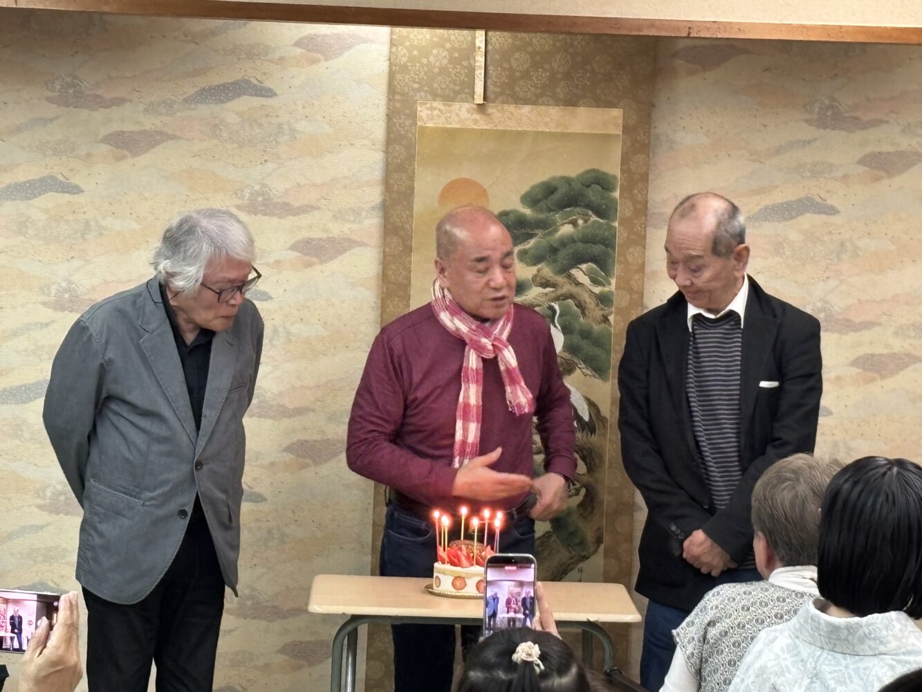 4月に誕生日を迎えたのが師匠だけでなく他にお二人おられたので、三人揃ってステージへ。ハッピバースデーの大合唱でお祝いさせていただきました。