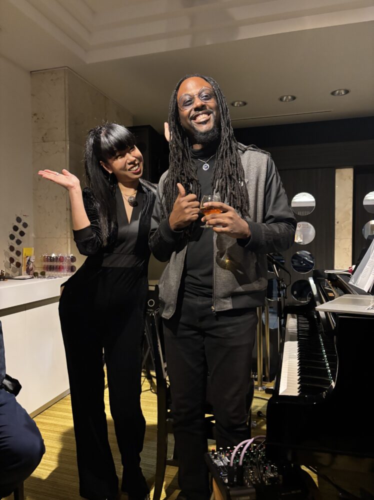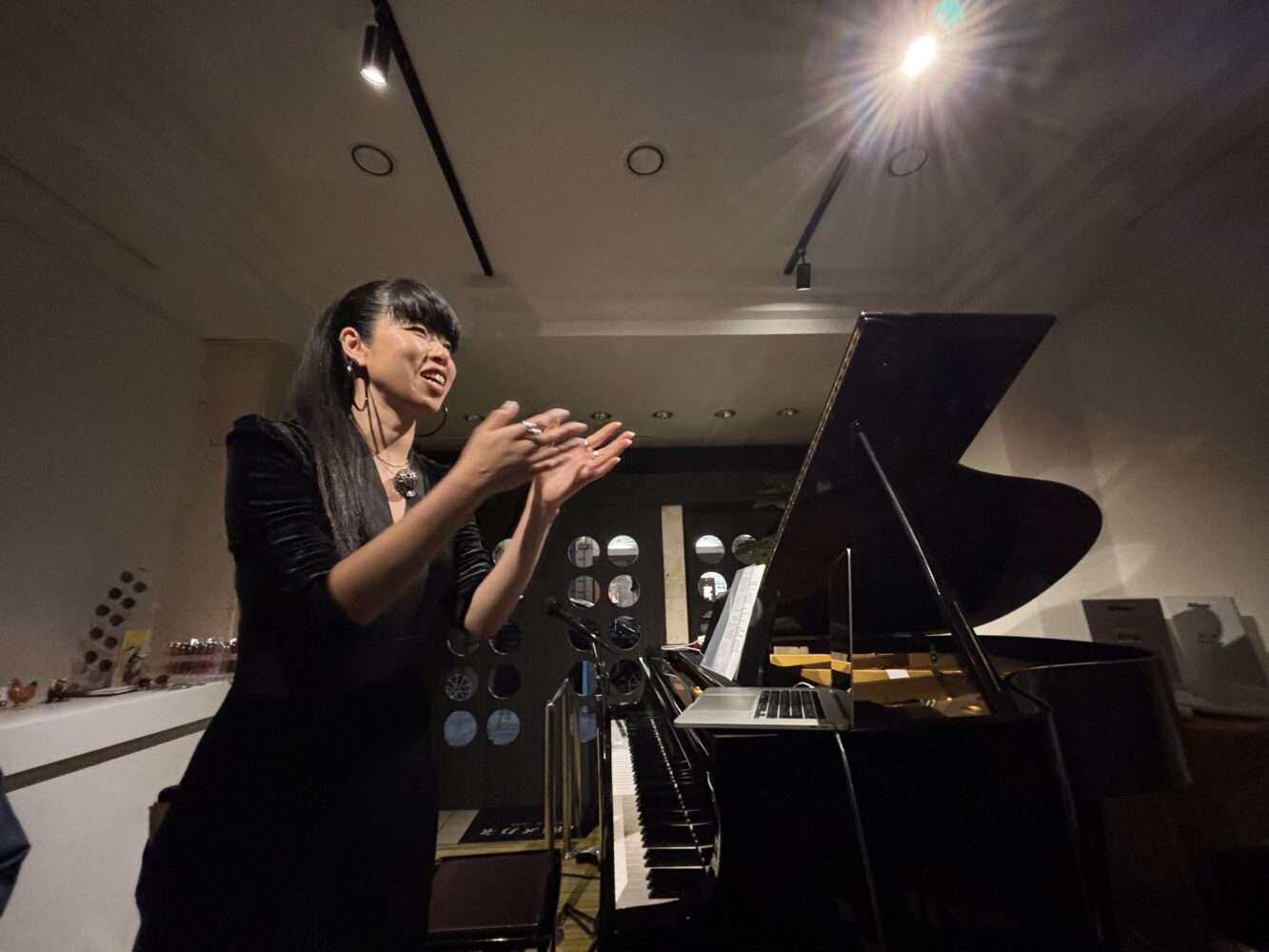 ゴードンさんのピアノの向こうに私!これ、お店の外の小さな小窓から撮られたとは思えないです。(驚)