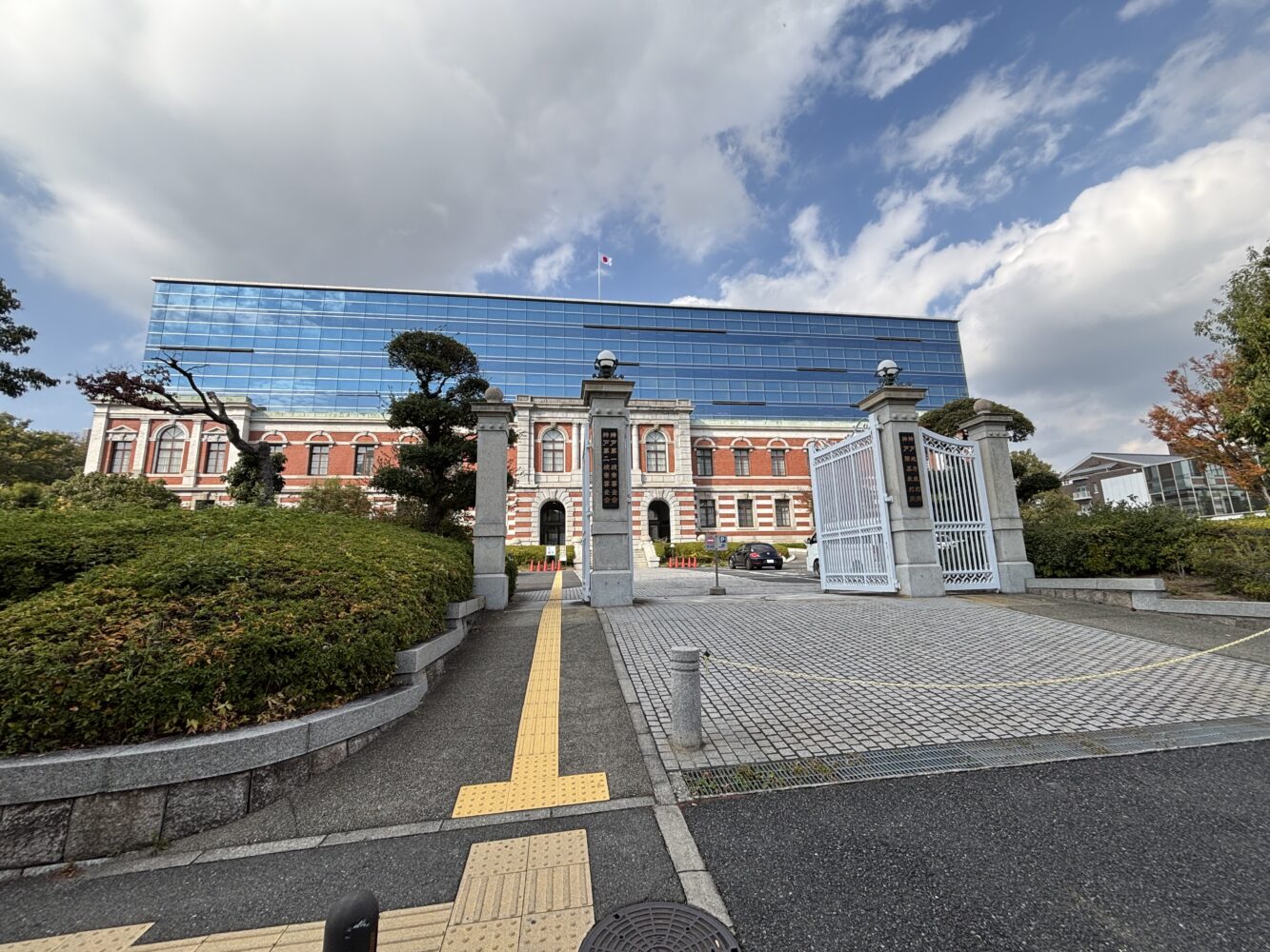 神戸地方裁判所のホームページによりますと!【神戸地方裁判所は,平成2年の建て替えにより現在の姿になりました。明治37年河合浩蔵氏の設計・管理による赤煉の旧庁舎の上に,ハーフ・ミラーのガラスカーテンウォール工法を採用して建設されました。ハーフ・ミラーのガラスが空の色を映し出し,赤煉瓦の壁の上にあたかも天空が広がっているように見え,過去から未来へ発展させていくという願いを込めています。】との事で、素敵な建物です。*転載させていただきました。