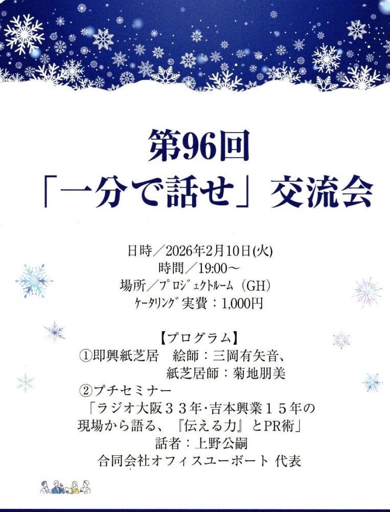 グランフロント大阪北館7階のナレッジサロンで2月10日(火)開催された「1分で話せ」交流会のプチセミナーでお喋り叔父さんをさせていただきました。
