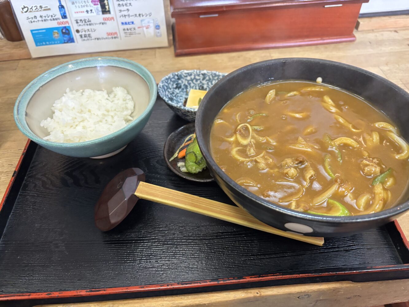 カレーうどんは1050円。ご飯、小鉢、お漬物がついてランチタイムは1100円なので迷わずセットを注文。料金は同じでも私は麺の大盛りは頼んだことがないです。