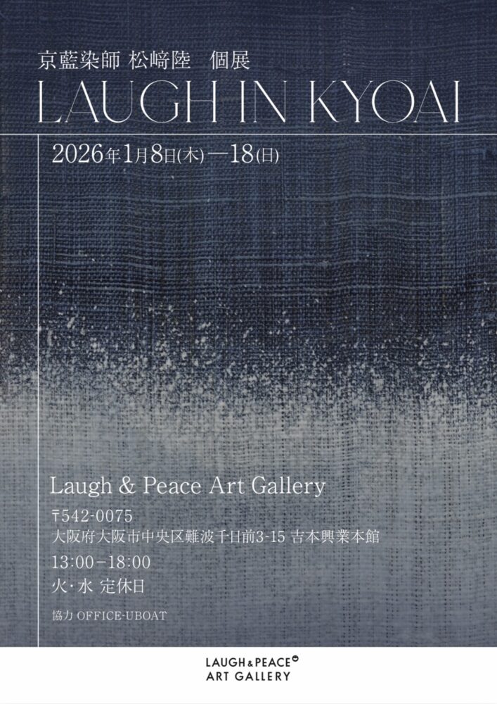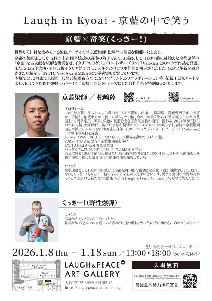 年明けの1月8日(木)から1月18日(日)まで私の古巣!なんばの「Laugh & Peace Art Gallery」で開催する京藍「松崎陸」さんの個展のチラシが裏表完成しました。 おって、お会いした皆さんに配布させて下さいね。(笑)