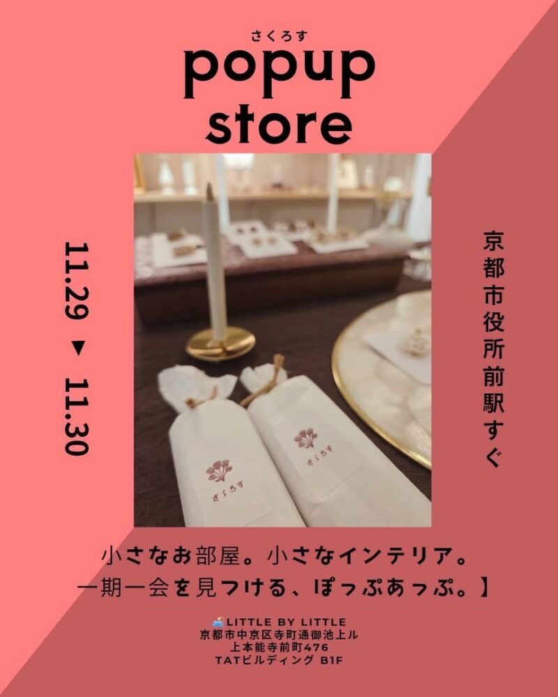腹ごしらえも終えて、今度は京都市役所横の「little by little」さんでポップアップストアが開催されているのでお伺いしてきました。その名も「さくろす」♬♬♬