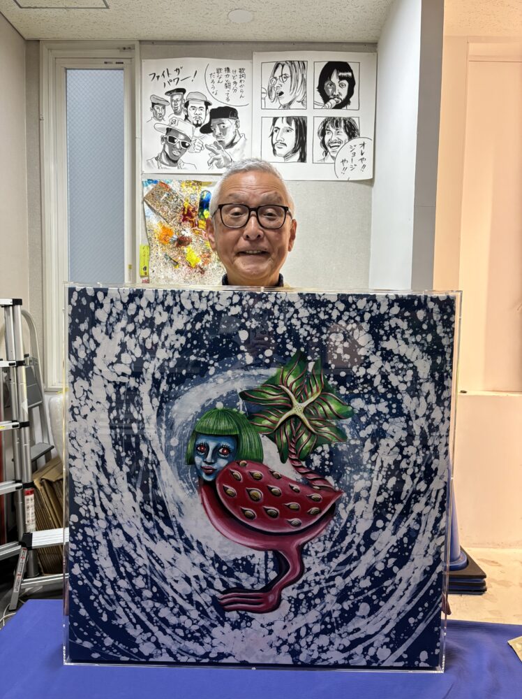 過日の、発表会見の時のスリーショット!くっきーさん、松崎さん、ギャラリーの皆さん、ご購入いただいた皆様も本当にありがとうございました。