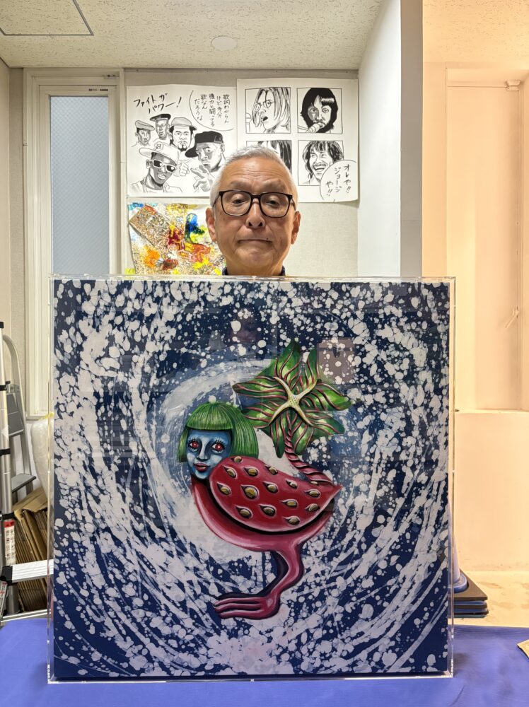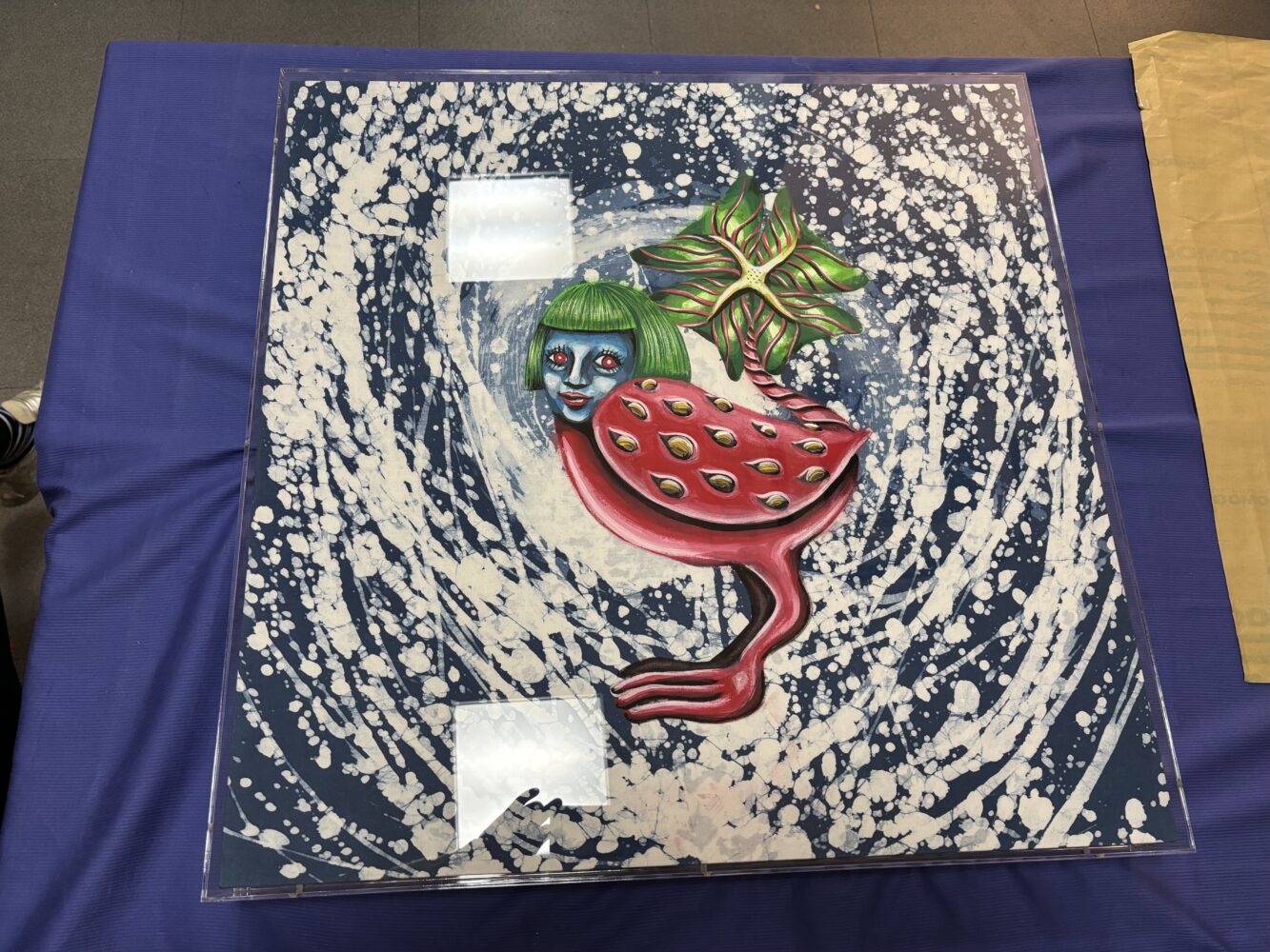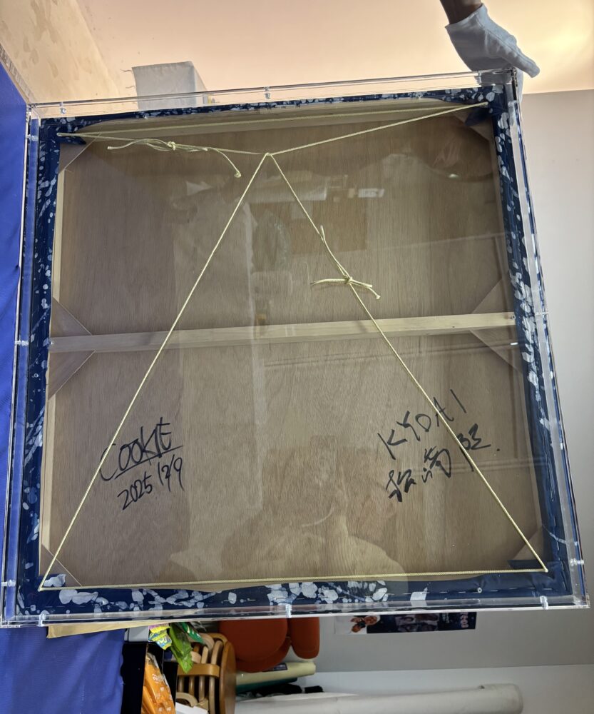当然、裏面もアクリル板で覆っています。向かって左にくっきーさんのサイン。右に京藍染の松崎さんのサインもしっかり見えます。「箱入り」娘が嫁に行く日に喜ぶ私(爆)
